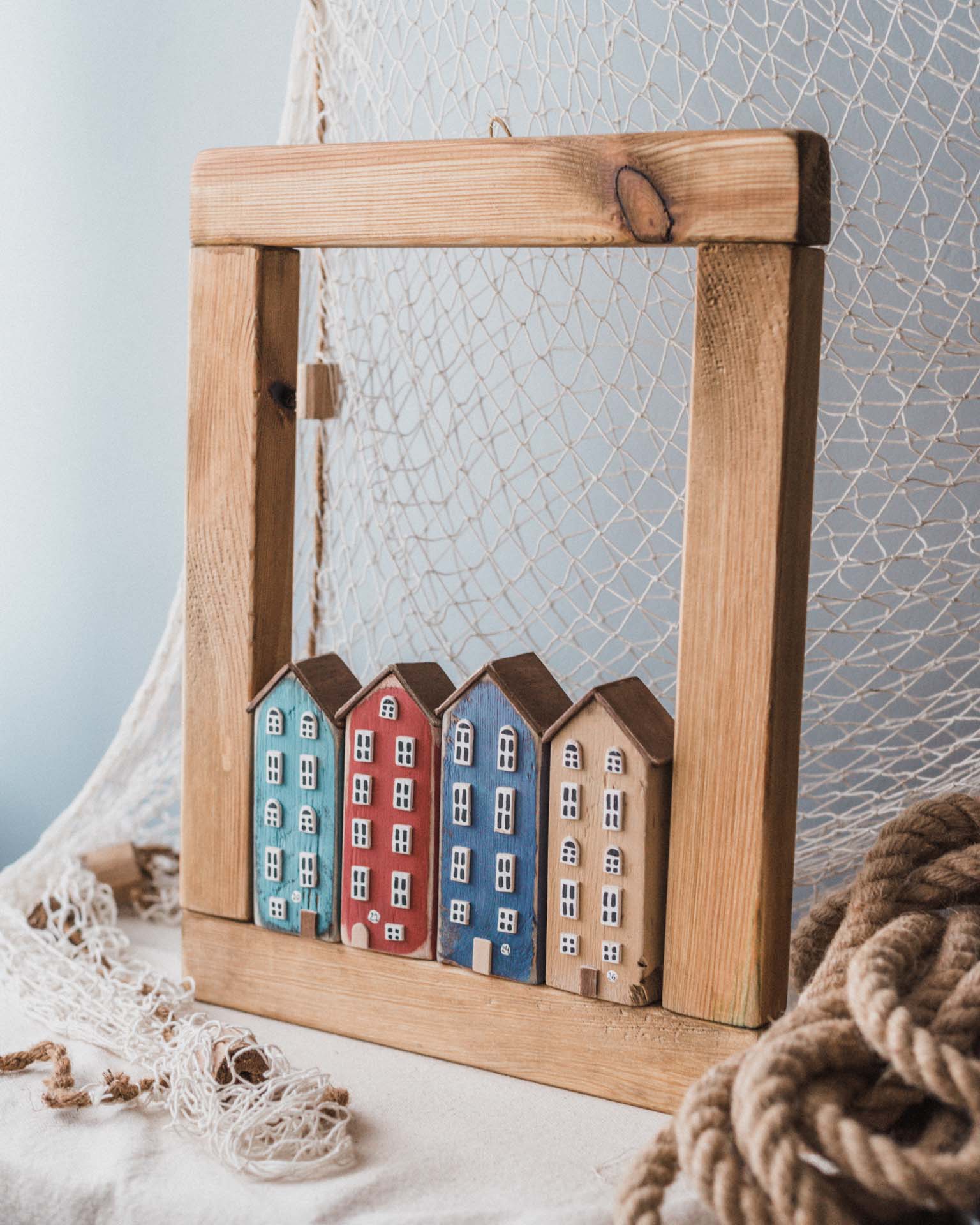 Drewniana Rama z Morskimi Domkami